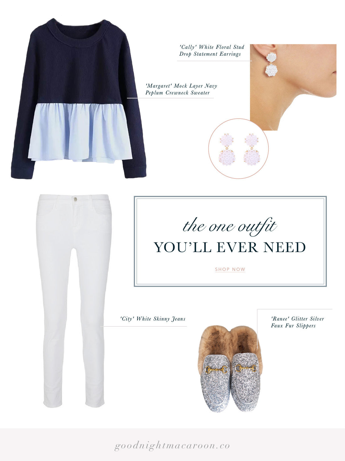 'Margaret' Mock Layer Navy Peplum Crewneck Sweater // 'City' White Skinny Jeans // 'Cally' White Floral Stud Drop Statement Earrings // 'Ranee' Glitter Silver Faux Fur Slippers