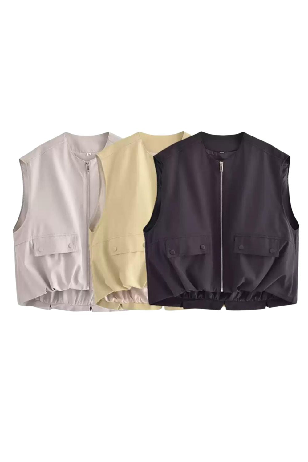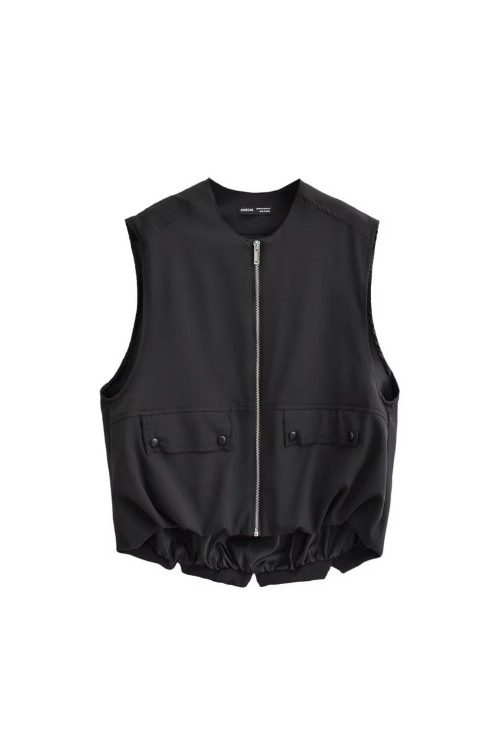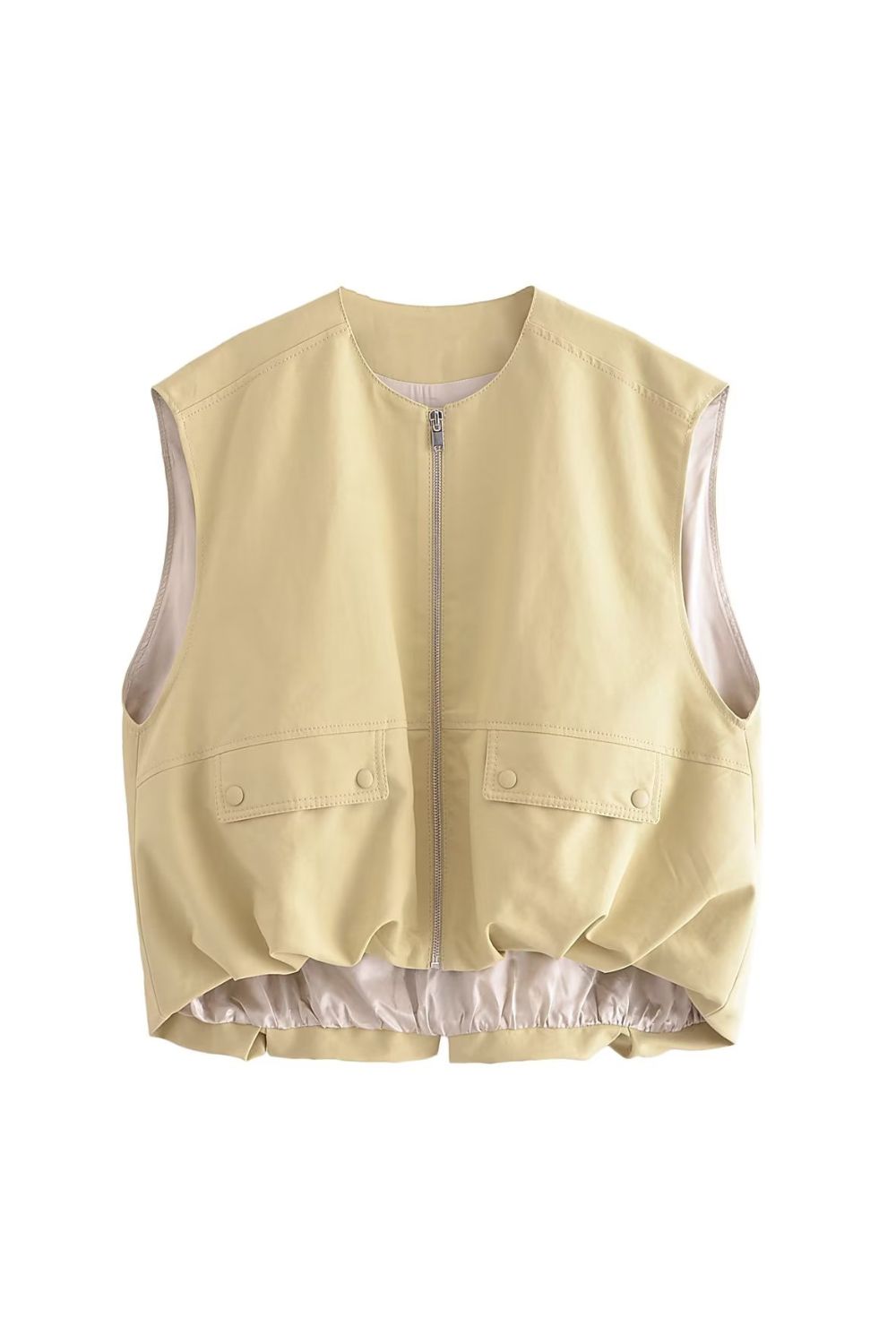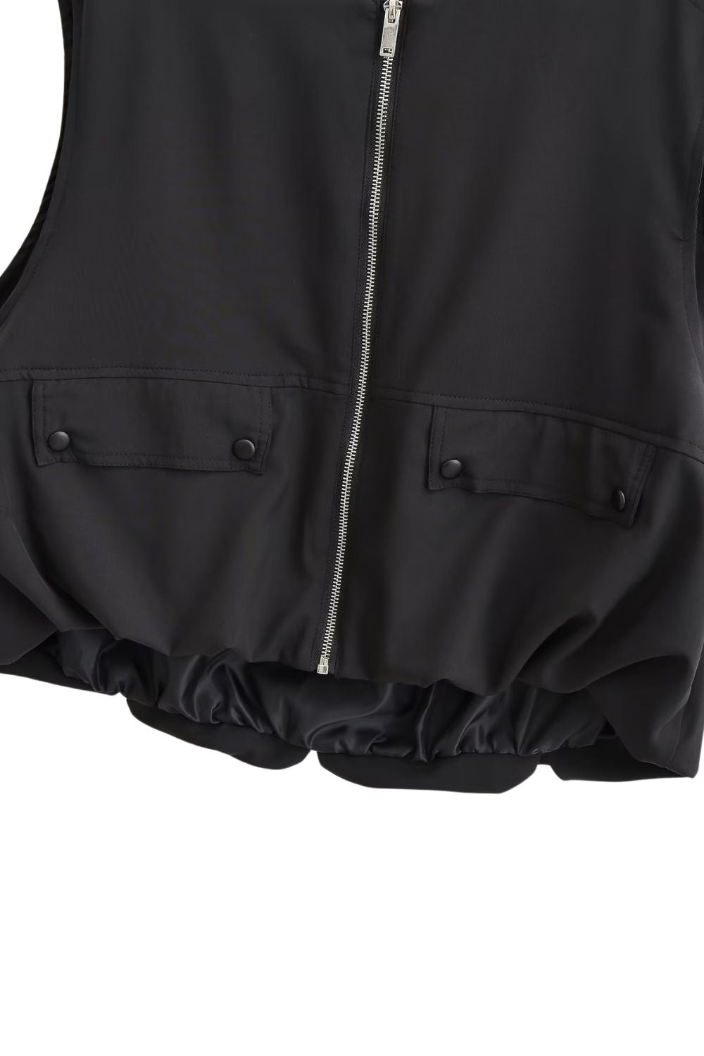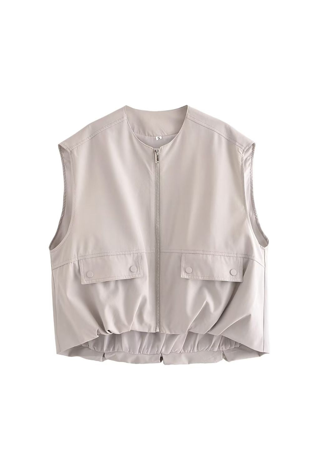Cotton Vest. Round neckline, sleeveless. Front features buttoned flap pockets. Pleated hem design. Lined. Front metal zipper closure