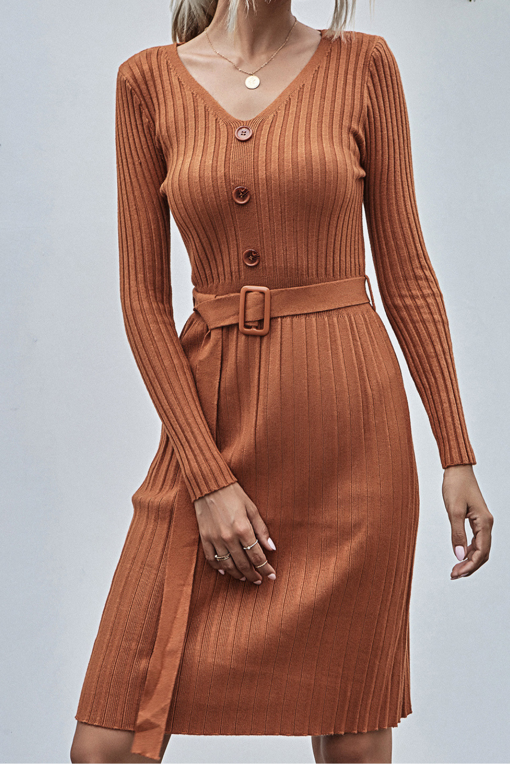 'Fia' V-neck Knit Long Button Dress with Belt